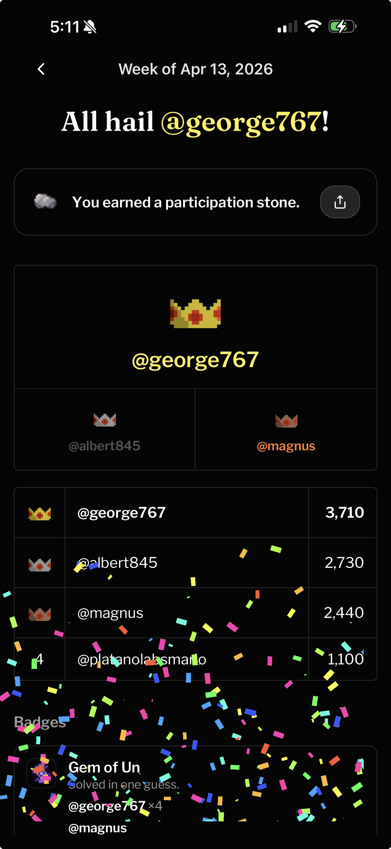 Enjoy weekly recaps showcasing your dominant word-guessing performances.